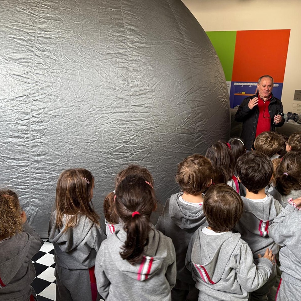 À chegada, foram calorosamente recebidas com sorrisos e convidadas a entrar num planetário insuflável. Lá dentro, as crianças puderam ver um céu repleto de estrelas e observar a Lua bem de perto! Descobriram que o Sol é a estrela mais próxima da Terra e também a mais importante para a nossa vida. Foram ainda desafiados a usar a imaginação para reconhecer imagens nas constelações visíveis no céu noturno.